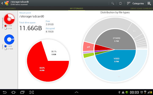 ● File categories. All files in internal and external storage,SD card or USB device are presented in a structured way: