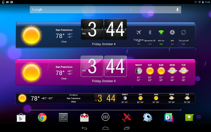 HD Widgets includes over 100 beautiful widgets that show current time, current weather, weather forecast, and utility switches. We put a TON of time into designing each widget to look great on every Android screen.