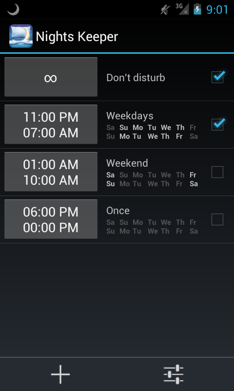 Like to take a nap from time to time? Don’t want to be interrupted on an important meeting? Profile “Don’t disturb” is for you. Setup full functional profile and turn it on/off manually by pressing on home screen widget at any time.