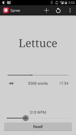 Spree helps you read your content faster by removing the need to move your eyes while reading. Just add your text, hit done and press 'Read'!